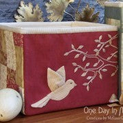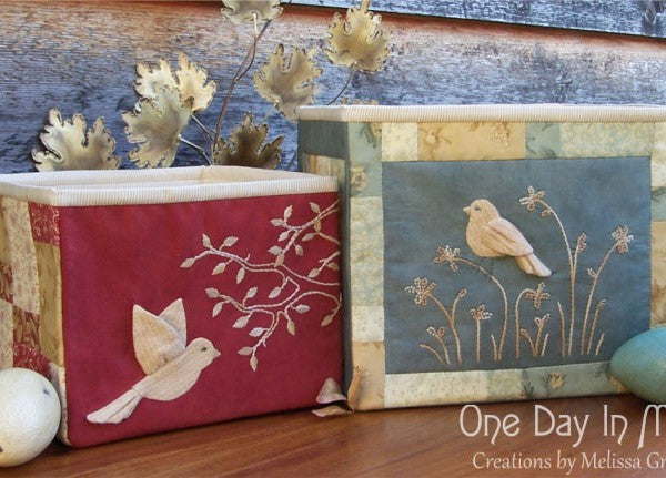 – The applique and stitchery panels are interchangeable and may be used for either size box. The sides of both boxes are pieced and quilted, and the feature panel of the larger box has a patchwork border. The back of the larger box also features a handy pocket to store some of those smaller and easily mislaid notions and tools.